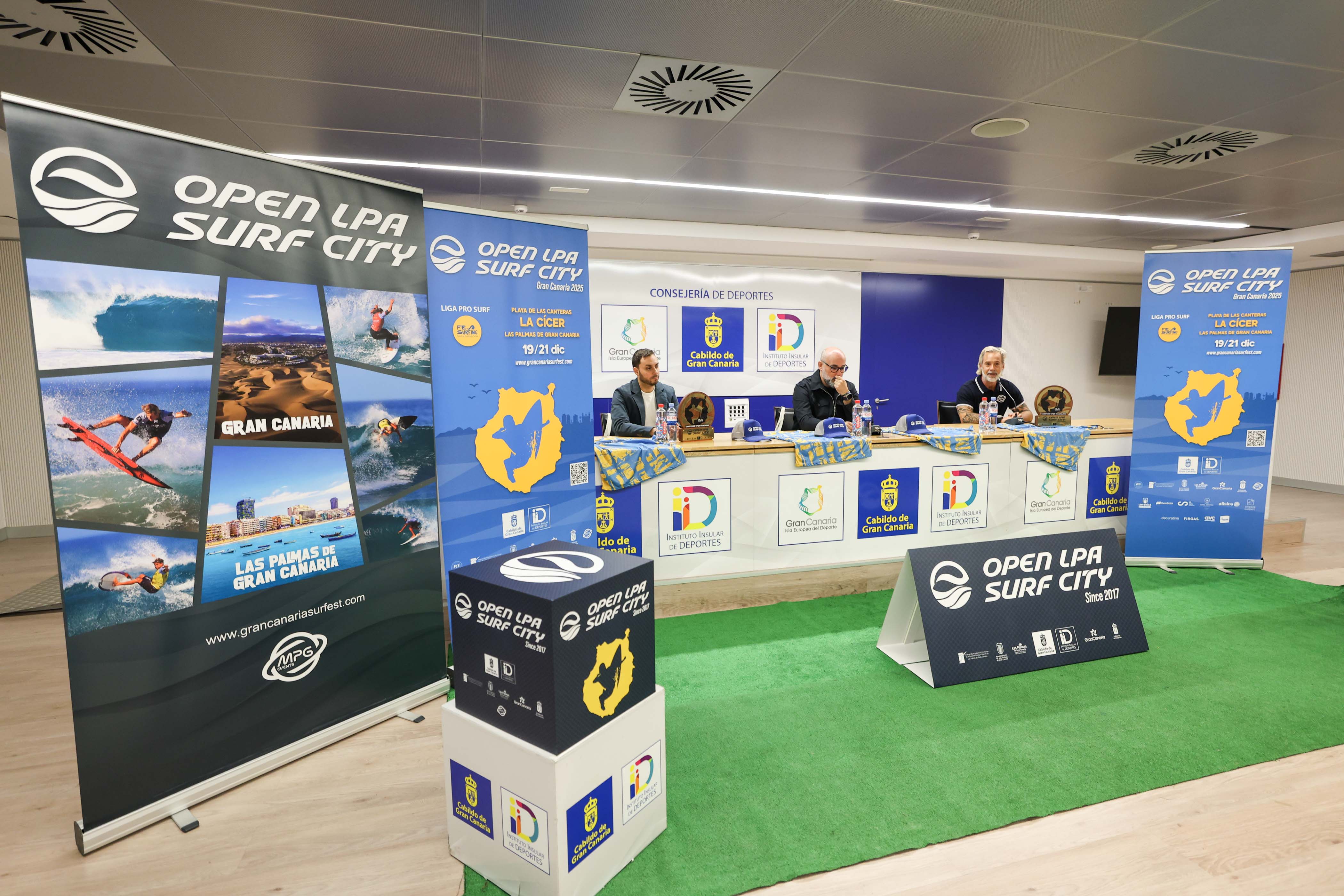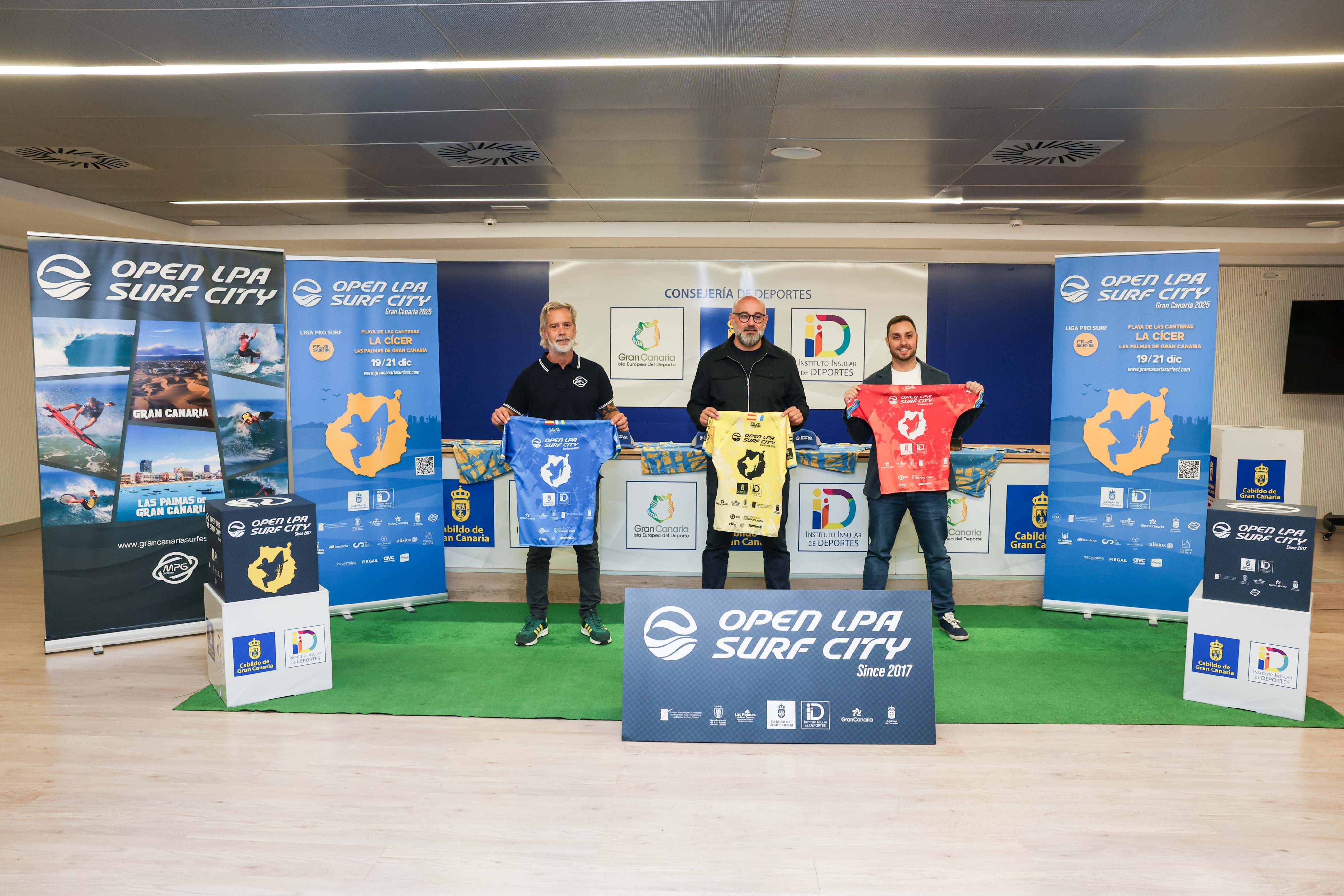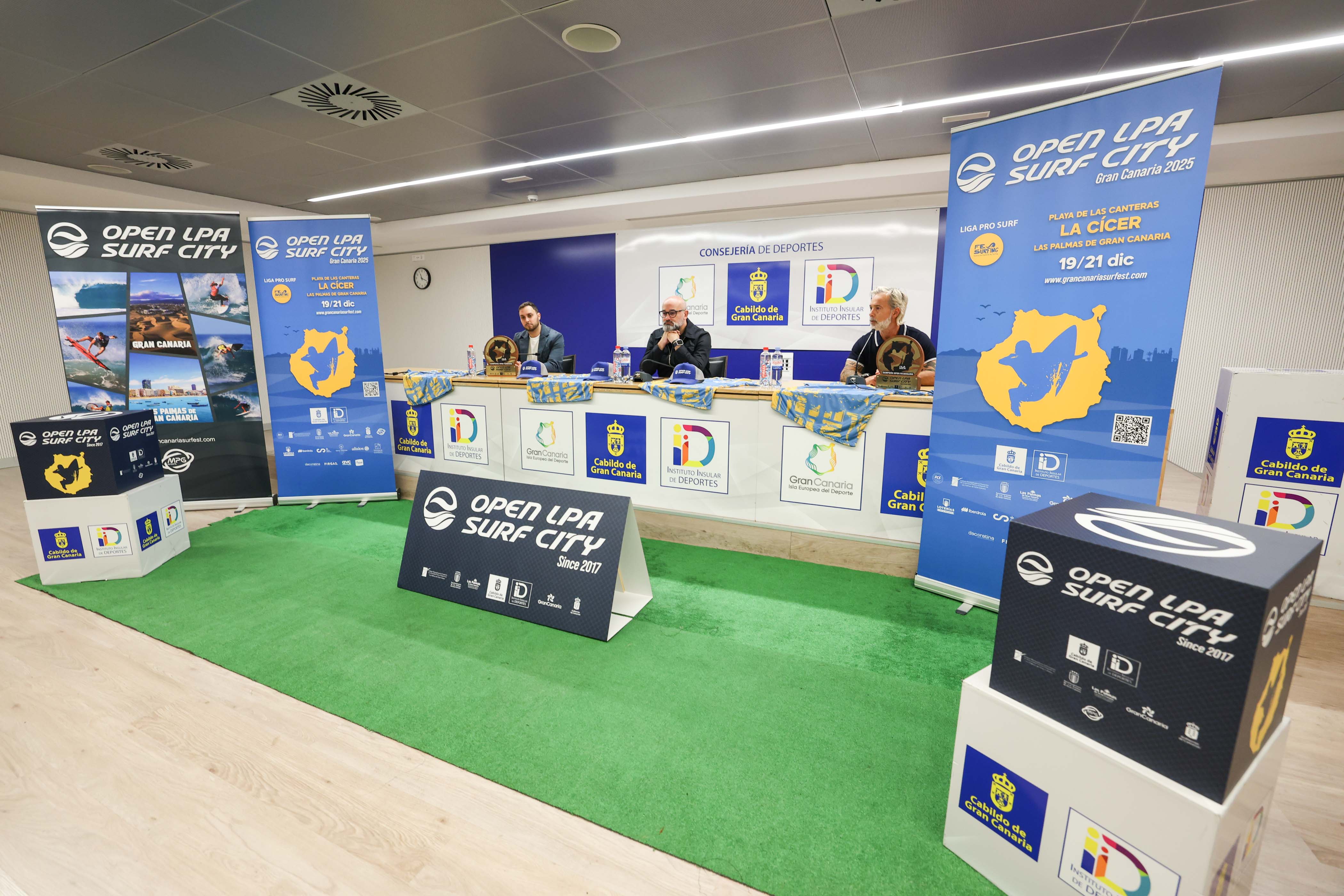 Hoy se ha presentado oficialmente con la presencia del consejero de Deportes del Cabildo de Gran Canaria, Aridany Romero, el gerente del Instituto Municipal para la Promoción de la Actividad Física y el Deporte del Ayuntamiento de Las Palmas de Gran Canaria, Eloy García y el director del Open LPA Surf City 2025 Vicente Pérez.