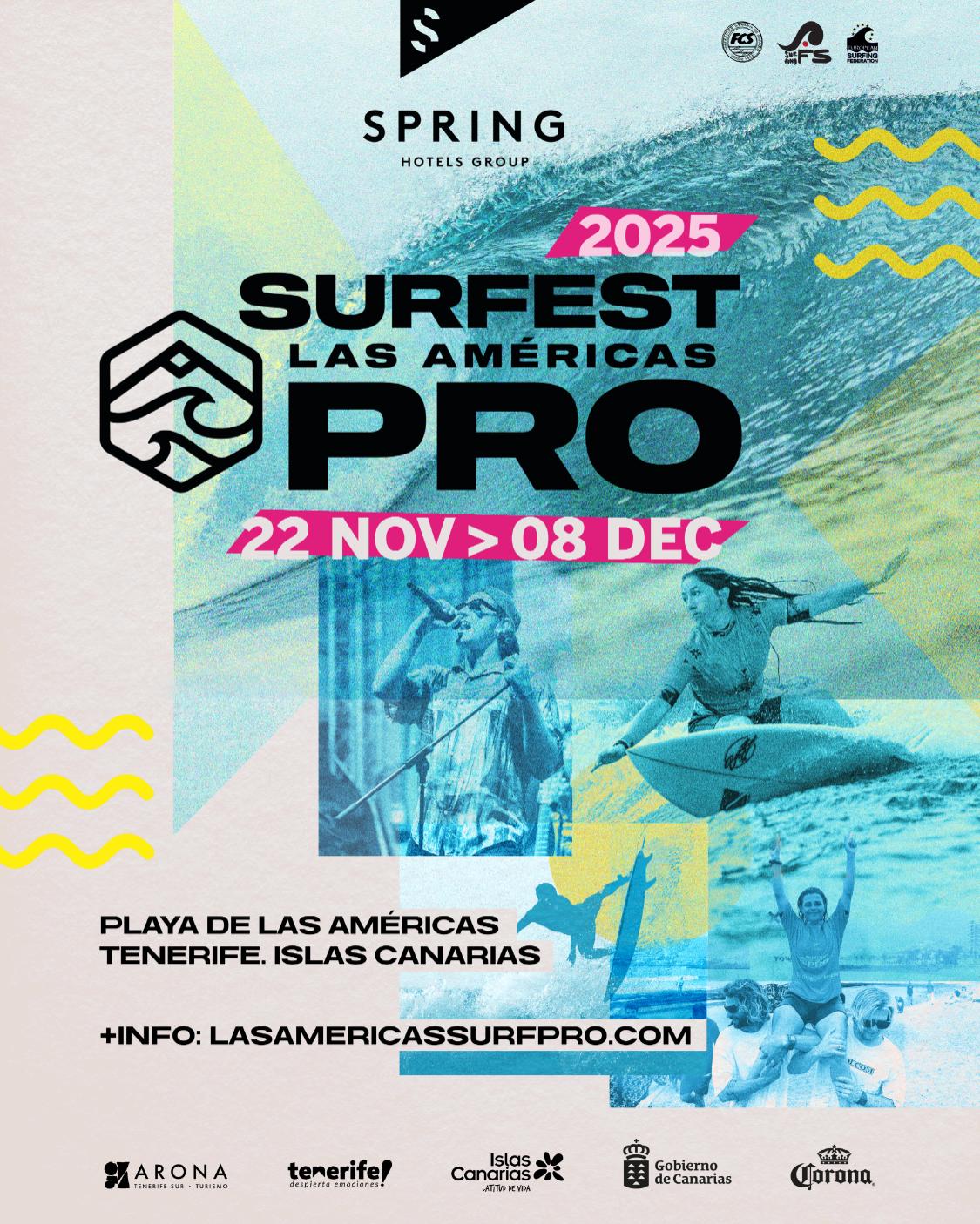 La comunidad europea del surf se reunirá del 22 de noviembre al 8 de diciembre de 2025 para una nueva edición del Spring Surfest Las Américas Pro, que celebra su octavo año consecutivo de competición de máximo nivel. El evento cuenta con el apoyo de Turismo Arona y Turismo de Tenerife, dentro de la iniciativa “Tenerife Despierta Emociones”.